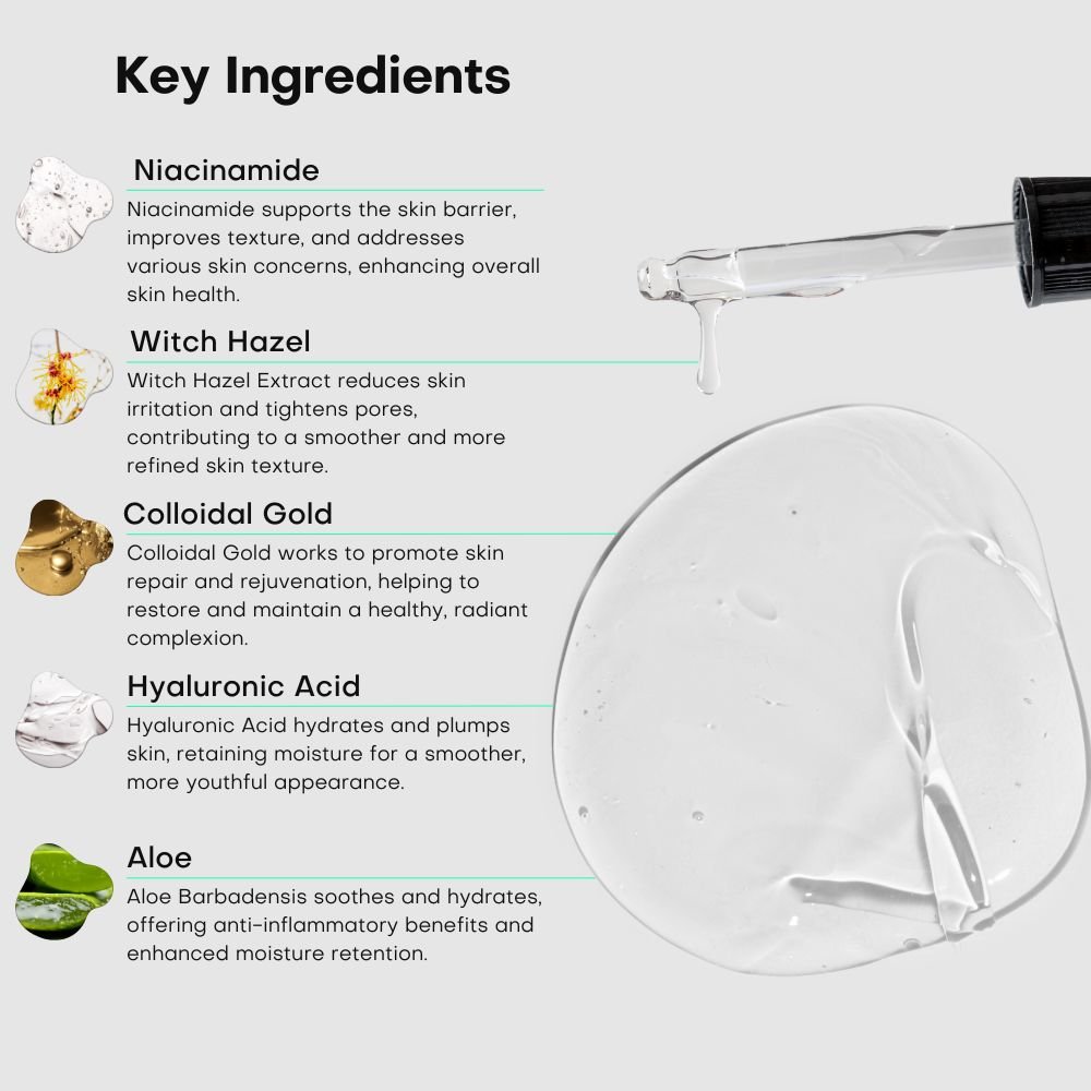 Aqua, Glycerin, Sorbitol, Polysorbate 20, Niacinamide, Phenoxyethanol, Aloe Barbadensis, Fragrance, Dimethyl-Dimethyl Hydantoin, Xanthan Gum, Sodium Hyaluronate (Hyaluronic Acid), Propanediol, Pentylene Glycol, Disodium EDTA, Witch Hazel Extract, Colloidal Gold, PEG-40 Hydrogenated Castor Oil, Sodium Benzoate, and Sodium Lactate.